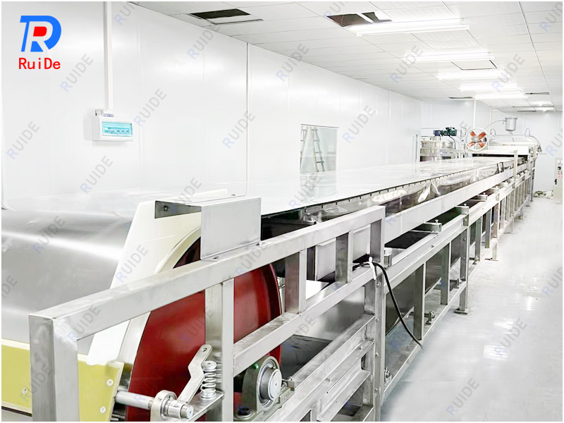 The cooling of the material from the fabric dispenser to the product discharge end is roughly divided into three parts