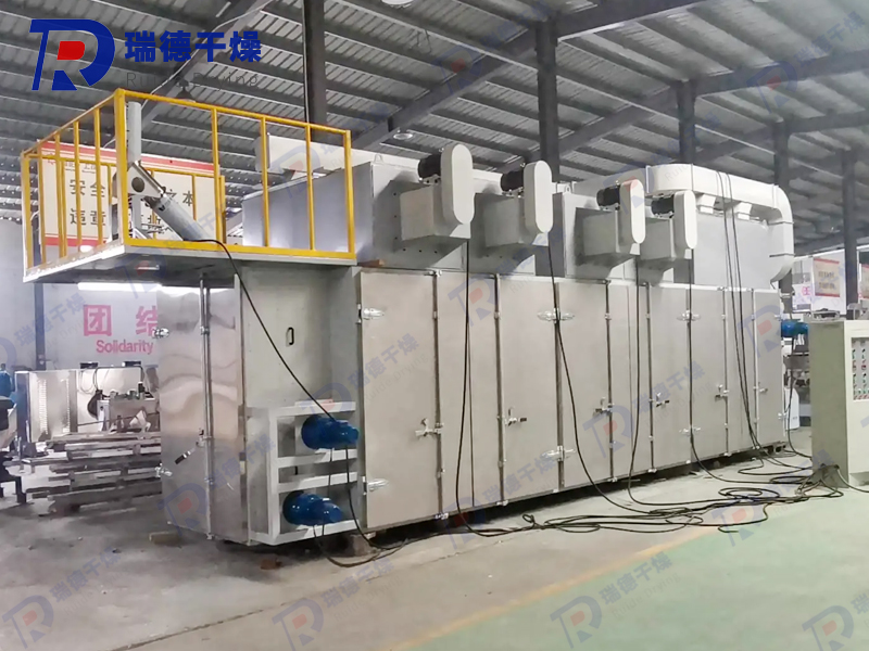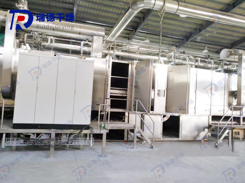 The material is evenly spread on the net belt by the feeder, and the net belt is made of 12-60 mesh stainless steel wire mesh. It is moved in the dryer by the drive. The dryer is composed of a number of units, each unit independent circulation of hot air, part of the exhaust gas is discharged by the special exhaust fan, the exhaust gas is controlled by the regulating valve, the hot gas from the bottom up or from the top down through the material on the net belt, heating and drying and taking away water. The mesh belt moves slowly, the running speed can be freely adjusted according to the temperature of the material, and the finished product after drying falls into the feeder continuously. The upper and lower cycle units can be flexibly equipped according to user needs, and the number of units can be selected according to needs.