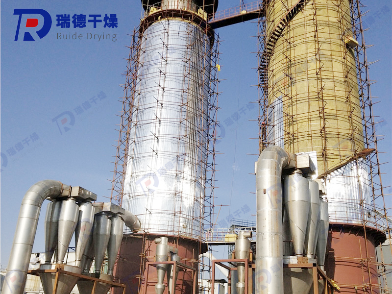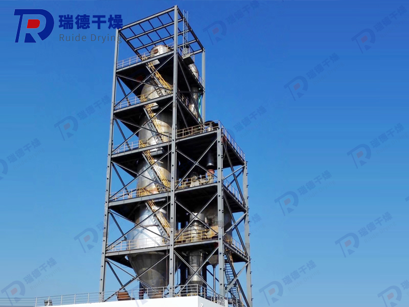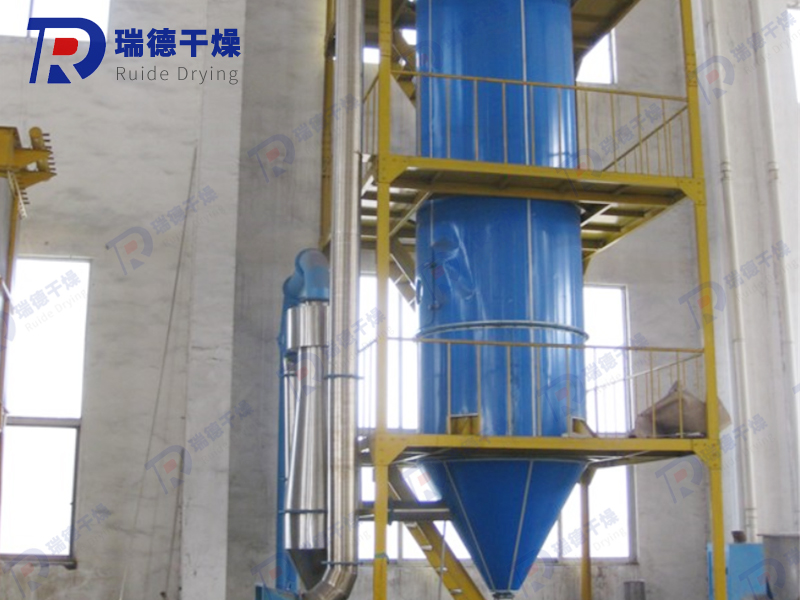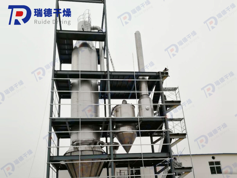 The feed liquid is input under high pressure through a diaphragm pump, spraying mist like droplets, and then flowing down in parallel with hot air. Most of the powder particles are collected by the bottom discharge port of the tower, and the exhaust gas and its small powder are separated by a cyclone separator. The exhaust gas is discharged by a fan, and the powder is collected by a pollination tube located at the lower end of the cyclone separator. The fan outlet can also be equipped with a secondary dust removal device, with a recovery rate of over 96-98%.
