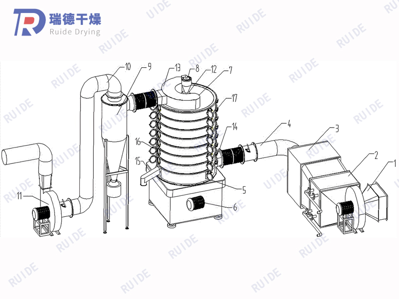 4、物料沿螺旋床自上而下作圓周運動的同時,自身也產生跳躍,從而增加了物料與熱風的接觸,增強了干燥效果。
