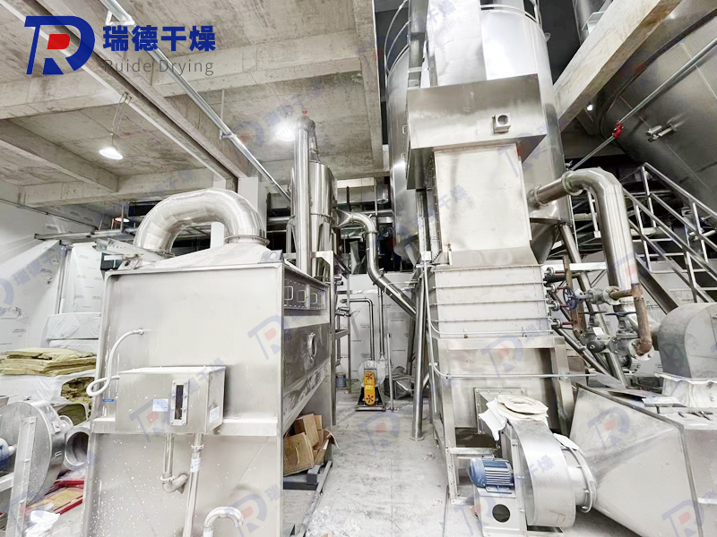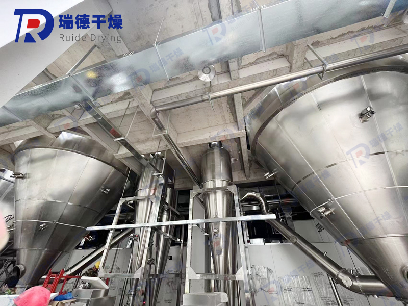 空氣經空氣過濾器后進入空氣加熱器,當空氣加熱器到給定的溫度后以切線方向進入熱風分配器,經熱風分配器作用后的空氣,均勻地、螺旋式地進入干燥室,同時料液由霧化器霧化為20~60um的霧滴,當霧滴與熱空氣接觸后就迅速汽化干燥為粉末或顆粒產品。采用旋風風離器直接收集后經氣力輸送至效料倉,完成物料的冷卻及輸送,廢氣由風機排出口經水沫除塵器排出。